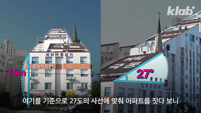 여기를 기준으로 27도의 사선에 맞춰 아파트를 짓다 보니