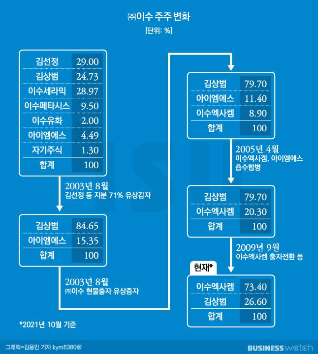 ㈜이수의 1대주주(79.3%)로 있던 김 회장이 지주회사의 최대주주 자리를 이수엑사켐에 내주게 됐던 사연이다. 현재는 26.6%에 머무른다. 이수엑사켐이 김 회장의 1인 회사인 까닭에 뭐, 김 회장의 계열 장악에는 아무런 문제가 없지만 말이다.