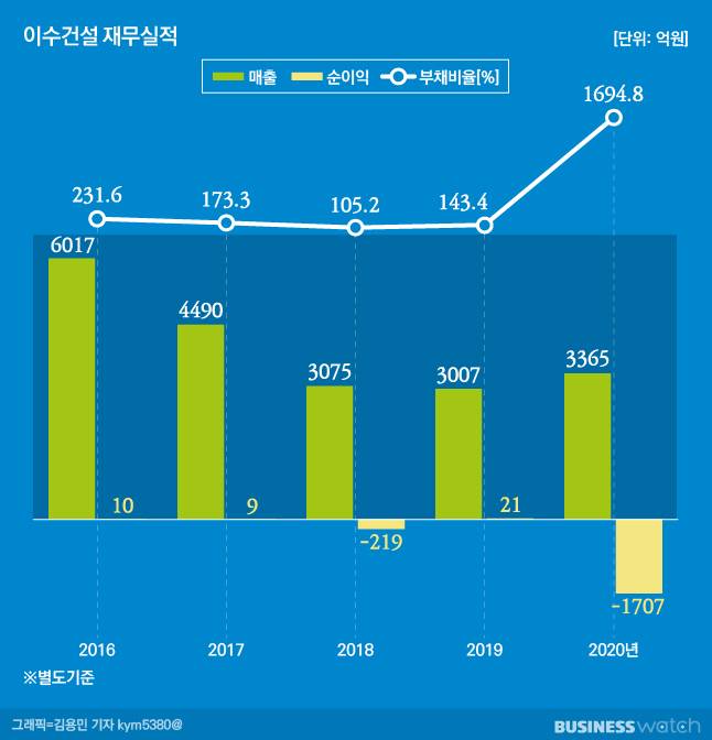딱 여기까지다. 2008년 글로벌 금융위기를 맞고 휘청거렸다. 주택분양사업 침체로 1410억원에 달하는 결손금이 쌓였다. 채권금융기관 공동관리(워크아웃)에 돌입했던 게 이듬해 3월이다. 2011년 6월 워크아웃을 졸업했지만 지금껏 후달리고 있다. 2020년 매출 3370억원에 순익적자가 1710억원이다. 순차입금(총차입금-현금성자산) 1072억원, 부채비율은 1695%로 치솟았다.