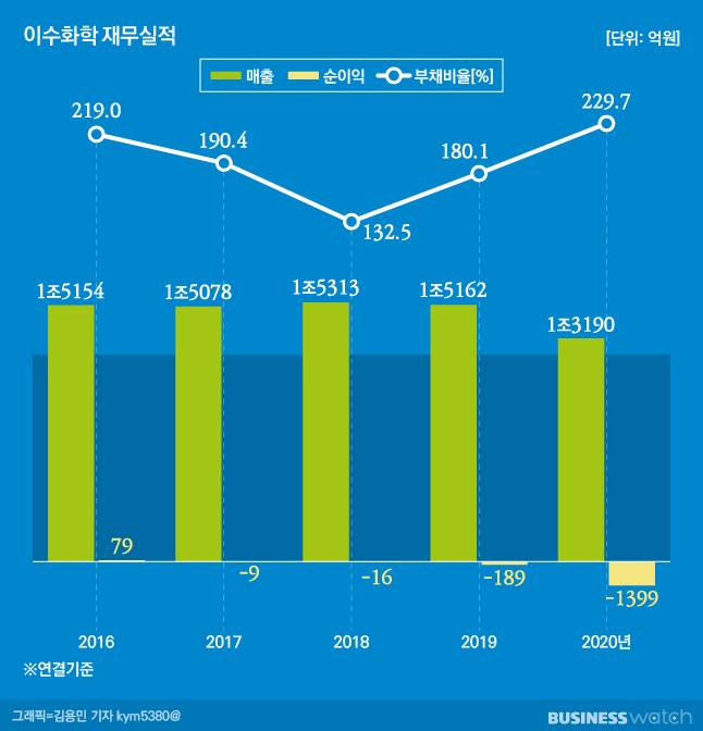 이수화학은 2012년 2조2300억원에 달했던 매출(연결기준)이 2020년 1조3200억원으로 쪼그라든 상태다. 특히 순익은 2013년 이후 딱 한번 2016년 흑자를 냈다. 작년에는 1340억원의 적자를 냈다.