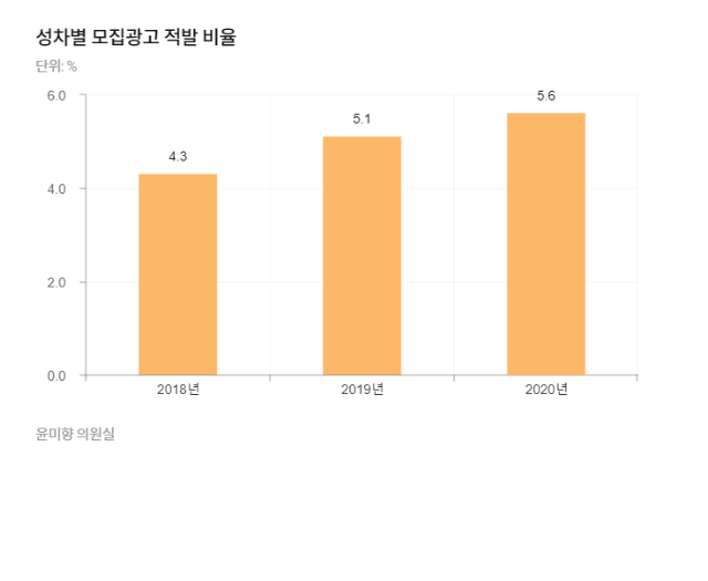 19일 국회 환경노동위원회 소속 윤미향 무소속 의원실이 고용노동부로부터 제출 받은 '2020년 직업정보제공사업체 모집광고 성차별 현황조사' 보고서에 따르면, 국내 7개 사이트(알바몬·알바천국·사람인·벼룩시장·잡코리아·인크루트·커리어) 공고 1만2,000개 중 성차별 의심 광고는 716건이었다.