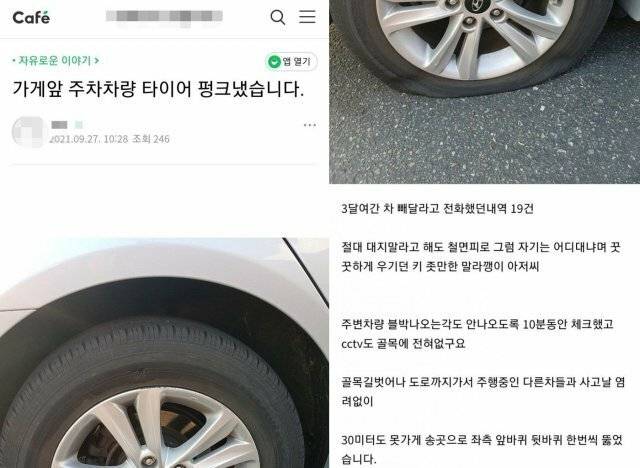 소상공인과 자영업자들의 인터넷 친목 커뮤니티 '아프니까 사장이다'에는 최근 '가게 앞 주차 차량 타이어 펑크 냈습니다'라는 제목의 사연이 올라왔다.