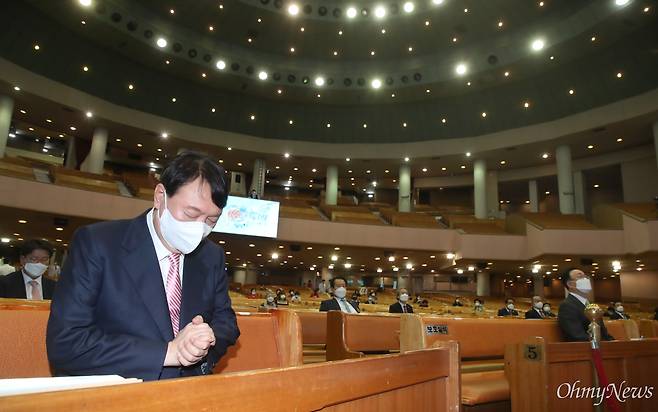 | ▲ 국민의힘 윤석열 대선 경선 예비후보가 지난 10일 오전 서울 여의도 순복음교회 본당을 찾아 예배에 앞서 기도하고 있다. |
