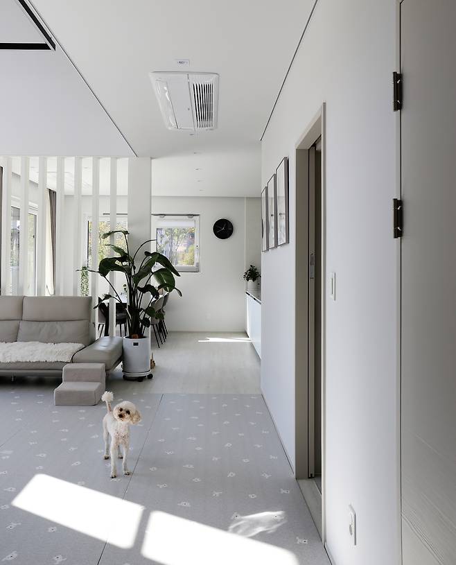 하랑재에는 건축주 부부와 세 딸과 막둥이이자 반려견인 보리가 살고 있다. 건축주 가족이 세종시에 들어온 지는 7년 차, 세종시에 집을 지어야겠다는 마음을 먹은 것은 4~5년 전이었다. 하지만 그때만 해도 당장 내 집을 짓겠다는 생각은 아니었다. 막연하게 단독주택 생활은 막내 대학 가면 누려보자는 생각이었다. 하지만 올 봄에 완공된 하랑재는 주택지 매입에서 집짓기까지 1년 채 걸리지 않았다. 가족들의 건강을 생각해 자연을 누리며 살자고 내린 결정이지만, 건축주 부부가 집을 짓게 한 중요한 원동력은 코로나 19였다고 말한다. 아파트에 살다보니 엘리베이터 타는 것도 불안하고, 집 밖을 나갈 수 없으니 답답했다. 자연스레 단독주택을 지어야겠다는 생각이 들었다.