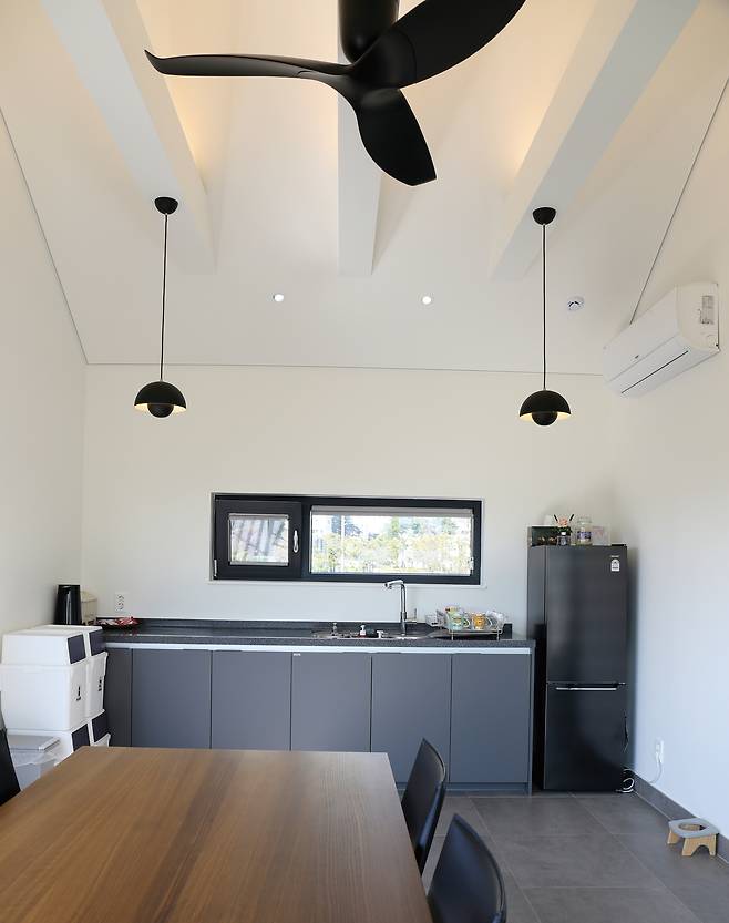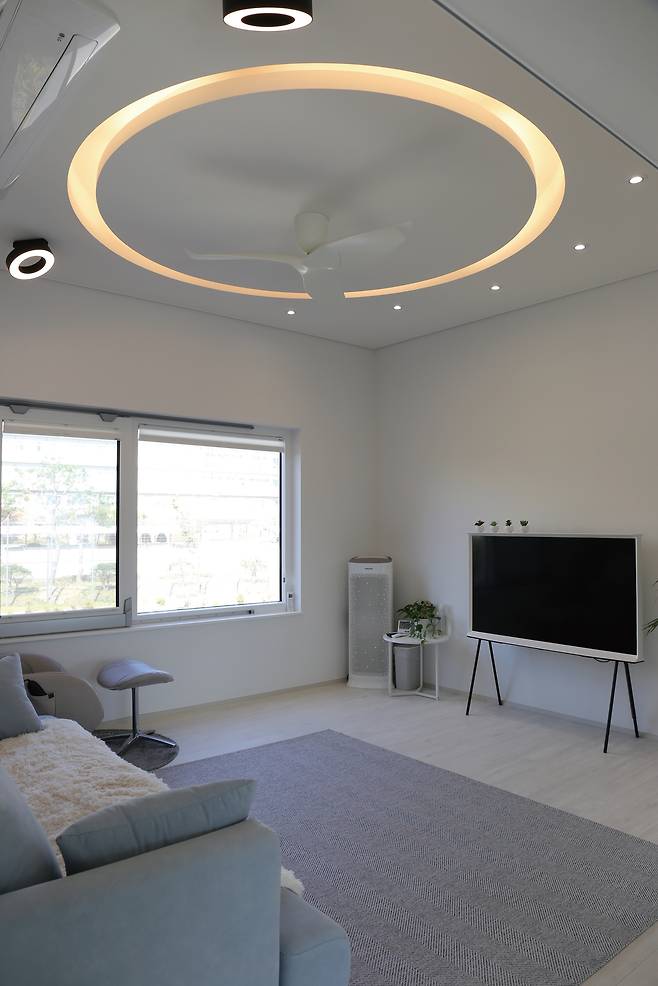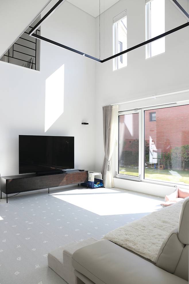 건축주는 주택 안팎을 심플하게 디자인했지만 빛을 이용해 하랑재 만의 매력을 살리고 싶었다고 한다. 1층 거실의 오픈 천장을 올려다보니 테두리만으로 디자인 된 ‘ㅁ’자 라인 조명과 그 사이로 실링팬이 한눈에 들어온다.