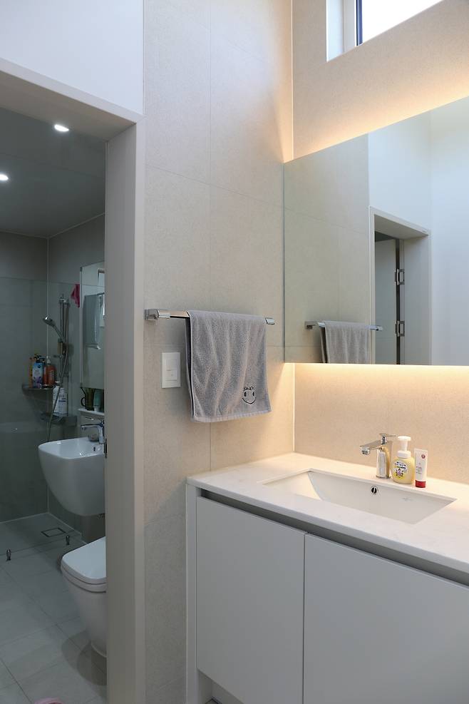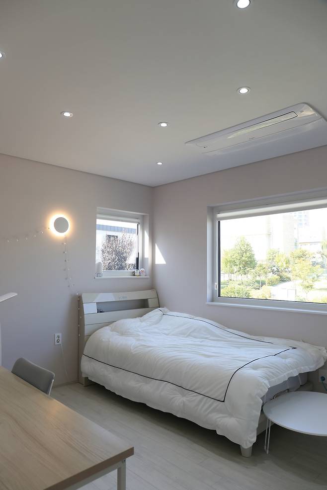 “가운데가 오픈된 천장이다 보니 냉난방 효율을 위해 실링팬을 꼭 달라는 선배 건축주들의 조언이 있었어요. 그런데 실링팬을 달려면 천장 매립등이나 벽부등으로 조도를 맞춰야 하는데, 그렇게 하기에는 원하는 밝기의 조도가 나오지 않았어요. 그래서 인테리어 디자인 유 실장님과 네 개의 라인이 ‘ㅁ’자의 형태를 이루는 주백색의 LED 등을 직접 디자인해서 달았죠. 이 등을 설치할 때 고생이 많았어요. 중심선을 잡는 데만 6시간은 족히 걸린 것 같아요.”