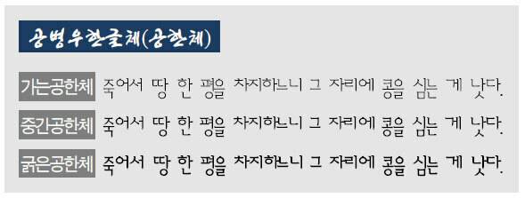공병우는 한글의 창제원리에 맞지 않는 네모 글자꼴의 한글 글꼴의 획일화도 비판했다. 그는 이른바 ‘빨랫줄 글꼴’이라 불리는 ‘공병우 한글’인 ‘공한체’를 만들었다. 네모꼴을 벗어난 형태의 공한체는 글자 높이가 다른 것이 특징인데 한글의 특징을 살린 글꼴이었다. 공한체는 교육에 효과적이며 가독성이 좋고 기계화가 쉬워서 시각 문화를 다양하게 발전시킬 가능성이 있는 것으로 평가받았다.