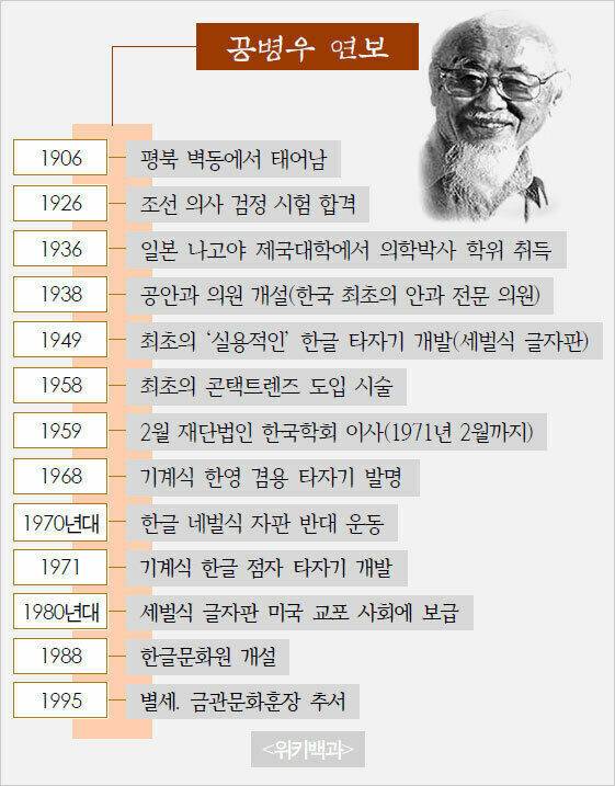 1995년 3월 7일 유명 안과의사이자 한글 운동가 공병우(1906~1995) 박사가 노환으로 타계했다. 향년 89세. 안과의사로 특이하게 한글 전용 운동과 한글 기계화와 전산화에 크게 이바지한 공병우는 유언도 남달랐다.