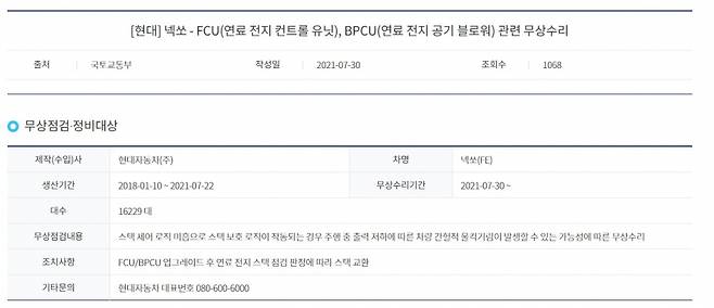 현대차는 조사에 착수했고, 올해 8월 무상 수리를 결정한다. 현대차 측은 "연료전지 스택을 보호하는 로직이 작동할 경우 주행 중 출력이 저하되고 간헐적으로 울컥거림 현상이 나타날 수 있다"면서 "지금까지 판매된 넥쏘 1만6229대에 대해 스택 교환을 포함한 무상수리를 진행할 것"이라고 발표했다.