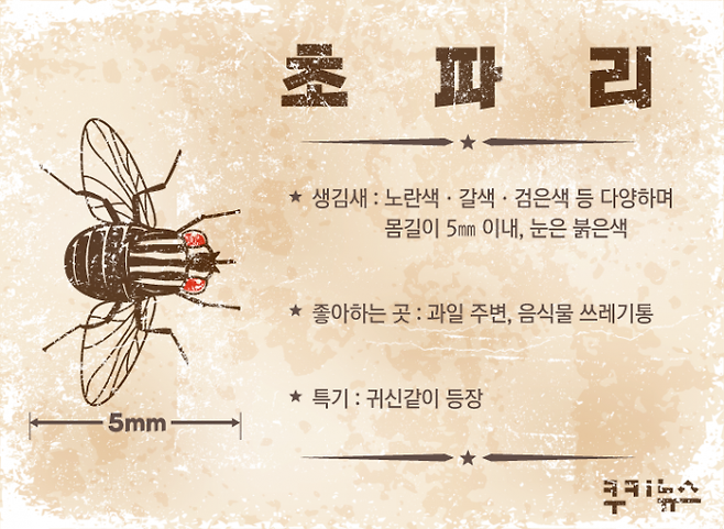 초파리는 과일 껍질을 그대로 놔두면 어김없이 출몰한다. 어찌나 귀신같이 찾아오는지 자연발생설까지 등장할 정도다. 한 번에 수백 개의 알을 낳고 번식하기 때문에 최대한 유입을 막아야 한다. 초파리의 ‘초(醋)’는 산성을 뜻한다. 뜻 그대로 달콤하고 시큼한 냄새를 좋아한다. 알은 보통 싱크대나 화장실, 베란다 등의 배수구에 낳는다.