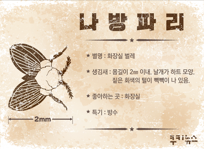 나방파리는 주로 화장실에서 발견된다. 화장실 벽에 새까만 점처럼 붙어있는 몸집 작은 벌레가 나방파리다. 가정집은 물론 공용 건물 화장실에서도 등장한다. 음식물을 오염시켜 식중독을 유발하기도 한다. 온몸에 둘러싸인 솜털에 방수 효과가 있어 물을 뿌려도 죽지 않는다.