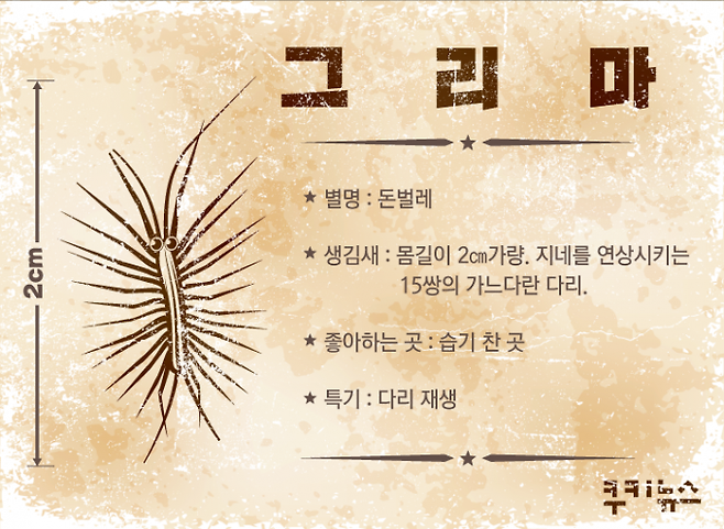 그리마를 아늑한 보금자리에서 만나면 소스라치게 놀랄 게 분명하다. 온몸을 얼어붙게 하는 생김새가 압권인 벌레다. 좌우 양쪽으로 15쌍의 다리가 나 있다. 가을 무렵 벽 틈새를 통해 집 안으로 들어온다. 과거 따뜻한 부잣집에서 자주 나와서 ‘돈벌레’라고도 불린다. 그리마를 잡으면 돈복이 나간다는 설은 미신이다.
