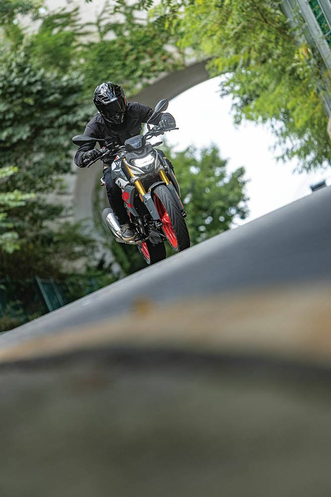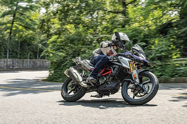 G 310 R의 특징은 라이딩 실력과 상관없이 뛰어난 균형 감각을 선사한다. 시선을 돌려 코너링을 시작할 때 핸들바가 주는 감각을 체 느끼기도 전에 앞머리가 자연스럽게 방향을 튼다. 서스펜션은 특별히 단단하지도, 너무 무르지도 않고 딱 적당하다. 라이딩 과정 전체에서 어떤 특정한 부분이 거슬리지 않는다. 양념이 강한 모터사이클을 찾는다면 심심하다고 느낄 수도 있겠다. 반면 내 경우에는 자극적이지 않고 편안한 세팅이어서 운전에 더 집중할 수 있었다. 엔진을 전진 배치한 구조 덕분에 휠베이스를 늘리지 않고도 스윙암 길이를 최대로 확보할 수 있었다. 그래서 실제로 타보면 쿼터 모델 중에는 뒷바퀴 접지력을 가장 차분하게 유지한다. 코너 직전에 급제동과 함께 방향을 틀거나, 혹은 가속 중에 불규칙한 노면을 만나도 엉덩이가 불안하게 움직이지 않는다.