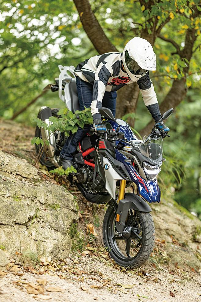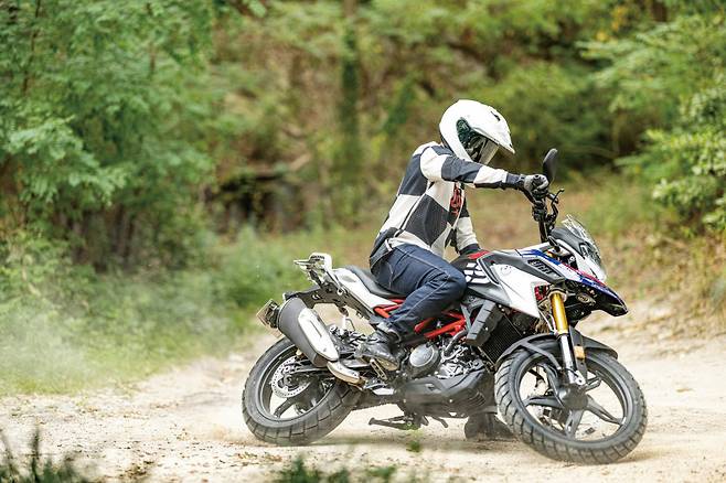 G 310 GS로 오프로드에 들어서자마자 치명적인 문제점을 찾았다. 기존 모델에서는 버튼으로 ABS의 해지가 가능했는데 신형에는 ABS 해제 버튼 자체가 없다. 따라서 본격적인 주행 자체가 제한된다. 하지만 그럼에도 바이크의 안정성이 좋기 때문에 비포장도로 수준은 가볍게 달릴 수 있다. 전후 트래블 180mm의 서스펜션 작은 요철부터 큰 충격까지 능숙하게 받아낸다. 순정 블록 패턴 타이어는 온로드와 오프로드 모두 무난한 마찰력을 유지한다. 차체가 콤팩트하고 핸들 조향각이 넓기 때문에 리어를 일부러 미끄러뜨리고 제어하는 재미가 있다. 가벼워진 클러치 레버덕분에 클러치 사용이 잦은 오프로드에서 다양한 스킬을 연습하기 좋다. 전반적으로 대형 어드벤처가 주파할 수 있는 코스는 대부분 따라갈 수 있을 정도다.