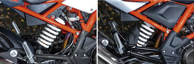 G 310 R의 엔진은 특별한 구조다. 일반적인 단기통 엔진과는 흡배기가 반대다. 엔진의 앞으로 흡기 장치를 달았고 뒤로 배기라인을 뽑아냈다. 앞뒤 무게 배분에 최적화된 설계. 엔진을 최대한 전진 배치시키며 얹어낸 이점이 있다. 라이더의 하중이 뒷바퀴에 실리는 것과 반대로 엔진은 앞바퀴 쪽으로 무게를 분산시킬 수 있다. 엔진 앞뒤가 바뀐 구조이기에 배기 라인이 뒤로 곧바로 나올 수밖에 없다. 따라서 촉매와 소음 억제 부분은 외부에 달린 큰 머플러가 담당하게 된다. 머플러를 최대한 숨기는 요즘 디자인 트렌드에 비하면 아쉬운 부분이지만, 그만큼 구조적인 장점도 있으니 개성으로 보는 것이 좋다.