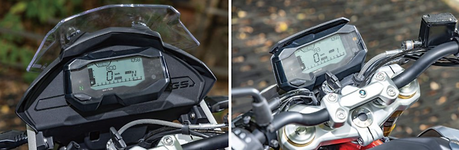 한눈에 더 단단하고, 한층 고성능처럼 보인다. 디자인은 플래그십 모델 S 1000 R의 흐름을 이어받으면서도 쿼터클래스 안에서 완성도를 높였다. 헤드라이트 좌우부터 덩어리처럼 이어진 차체는 단단한 근육을 연상하게 한다. 연료 탱크와 카울은 배기량에 비하면 한 사이즈 큰 느낌이다. 하지만 헐렁한 운동복이 아니라, 맞춤 정장처럼 핏이 딱 맞는다. 그만큼 시각적으로 만족감을 준다. LED 타입 헤드라이트와 방향지시등도 기본으로 달린다. 야간 주행에 노면 시인성이 그만큼 개선됐다. 상향등 밝기도 훨씬세다. 헤드라이트 가운데는 주간 주행등이 달렸다. 그래서 이제는 한낮에도 눈매가 매섭다. 계기반은 기존과 동일하다. 중심에 속도와 기어 단수를 표시하고, 하단엔 디지털 게이지로 엔진 회전수를 배치했다. 연료 잔량, 주행거리, 시계 외에도 조작 버튼 한 개를 통해 엔진 온도와 평균 속도 등 정보를 볼 수 있게 했다.