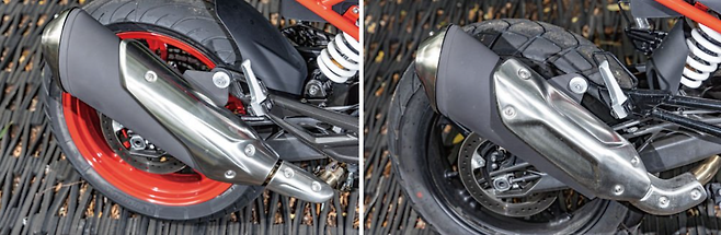 신형의 보디 컬러는 화이트와 블랙으로 나뉜다. 여기에 제품 가격이 10만원 더 비싼 스포트 스타일 컬러는 블랙과 화이트, 레드가 조화를 이룬다. 이번에 우리가 시승한 모델은 스포트 스타일로, 꽤나 요란한 모습이면서도 동시에 수준 높은 완성도를 보여줬다. 알루미늄 소재 17인치 캐스트 휠이 달렸다. 차체 옆면에 ‘R’과 같이, 빨간색으로 칠해져서 자극적이다. 휠과 메인 프레임을 화려하게 치장한 것과 반대로 엔진 부분은 은은하게 반사되는 블랙 컬러로 통일감 있게 처리했다. 사실 이전 모델에 비해 외형이 200%는 고급스러워진 이유가 여기에 있다. 디테일이 좋지 않은 부분은 감추고, 고급스러운 부분만 드러내는 전략이다. 물론 디자인뿐만 아니라 기능적으로 개선된 부분도 있다. 클러치 레버와 브레이크 레버가 조절식으로 바뀌었다. 총 네 단계로 핸들 그립과 간격을 최대 6mm까지 조정한다. 기본 시트 높이는 785mm로 이전과 같지만, 신형에선 세 가지 높이로 시트 조절이 가능하다