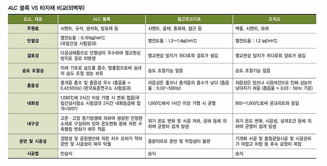 ALC는 경량성, 단열성, 가공성, 치수안정성, 내화성, 친환경성 등이 뛰어난 반면 압축강도가 콘크리나 시멘트벽돌보다 낮은 단점도 있다.