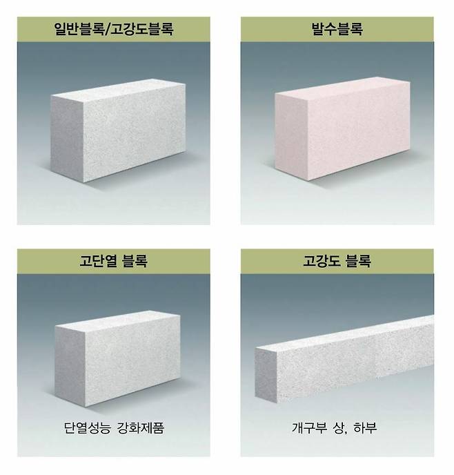 ALC 제품은 크게 ALC 블록BLOCK, ALC 판넬PANEL 제품으로 구분된다. ALC 블록BLOCK은 내외부 모든 벽체용(내력, 비내력)으로 사용할 수 있으며, 벽체별 요구 성능에 따라 제품 두께를 달리하여 적용하고 있다. 공동주택(APT), 오피스텔, 호텔, 단독주택부터 지식산업센터, 병원, 대형마트, 공장, 상가 등에 이르기까지 쓰이지 않는 건축물을 찾기 어려울 정도다.