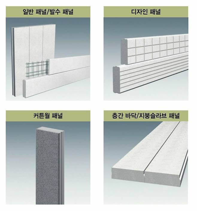 내·외벽용 패널은 표면이 평평하게 구성된 일반 패널과 표면에 일정한 길이로 무늬를 가공한 디자인 패널(패션 패널), 모서리 마감에 사용하는 코너패널 등이 있고, 슬래브 패널은 바닥슬래브 패널, 지붕슬래브 패널이 있다. 규격은 최대 길이 6m, 최대 폭은 60cm로 생산되고 있다.
