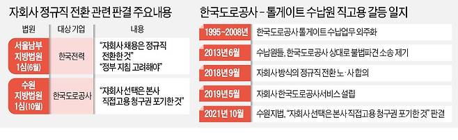 앞서 지난 6월에도 비슷한 판결이 나왔다. 서울남부지법 민사13부(부장판사 홍기찬)는 한국전력 자회사인 한전FMS 소속 근로자들이 한전을 상대로 불법파견을 주장하며 직고용 해달라고 낸 청구를 기각했다. 재판부는 “정부 지침에 따르면 자회사를 설립해 고용하는 것도 정규직 전환”이라며 “한전은 근로자들에 대한 정규직 고용의무를 이행한 것”이라고 판단했다.