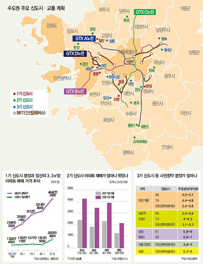 정부가 최근 지정한 3기 신도시도 인기를 끌 가능성이 높다. 정부는 남양주 왕숙, 고양 창릉, 부천 대장, 하남 교산, 인천 계양지구를 3기 신도시로 지정하고 사전청약에 나섰다. 서울 집값이 급등한 데다 임대차법 여파로 전셋값마저 폭등하자 3기 신도시 청약을 노리고 신도시로 이사하는 젊은 층이 급증했다. 수도권 집값 안정을 위해 3기 신도시 사전청약 물량은 주변 시세의 60~80% 수준으로 공급되는 덕분이다. 일례로 인천 계양신도시는 전용 59㎡ 아파트가 3억5000만원, 74㎡는 4억5000만원 선에 공급될 예정이다.