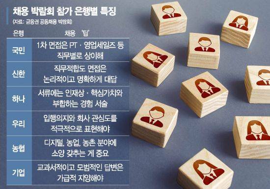 KB국민은행은 서류심사 후 필기시험을 보게 되는데 일반전형의 경우 직업기초능력과 직무심화지식 등을 평가받는다. IT·데이터 직종은 온라인 코딩테스트도 실시한다. 이후 치러지는 1차 면접에서도 채용직무와 관련된 PT·영업세일즈·실무면접 등을 봐야 한다. 신한은행은 서류에 자신의 역량을 효과적으로 표현해야 하고, 3단계 직무적합도 면접에서 관련 직군의 이해도가 필수라고 안내하고 있다. NH농협은행 역시 직무능력평가를 통해 지원자의 의사소통능력과 문제해결능력, 정보능력 등을 따진다. 특히 농업·농촌 이해도를 묻는 질문이 출제되고, 지원분야별로 다른 문제를 낸다.