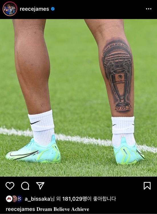 지난 시즌 유럽축구연맹(UEFA) 챔피언스리그(UCL) 우승을 기념하기 위해 첼시의 리스 제임스가 자신의 오른 다리에 타투를 새겼다.