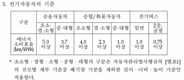 전기차로 분류되기 위해선 에너지소비효율이 초소형ㆍ경형ㆍ소형은 5.0km/kWh 이상, 중형과 대형은 3.7km/kWh 이상이어야 하며 복합 1회 충전 주행거리는 승용자동차의 경우 150km이상이어야 한다. 이를 충족해 전기차로 분류되면 취등록세 140만원 감면 혜택을 받을 수 있다.