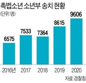 경찰청에 따르면 지난해 법원 소년부로 송치된 촉법소년은 9606명이다. 2016년(6575명) 대비 46% 늘었다. 최근 5년간 전체 촉법소년은 3만9694명으로 이 중 76%는 절도와 폭력 범죄를 저질렀다.