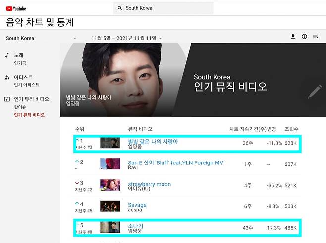 임영웅이 지난 3월 9일 공개한 '별빛 같은 나의 사랑아' 뮤직비디오는 11월 1주(11월 5일~11월 11일) 한국 유튜브 인기 뮤직비디오 톱100 차트 1위에 올랐다.