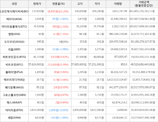 [표]가상화폐 시세 (제공: 암호화폐 거래소 업비트)