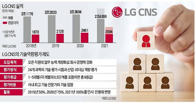 LG CNS는 2019년 나이와 직급에 상관없이 역량이 뛰어난 직원에게 더 많은 보상을 해 주는 기술 역량 레벨 평가제를 도입했다. 첫해 50%였던 기술 역량 레벨 연봉 인상 반영률이 올해는 100%로 확대됐다. 사내 공감대가 커진 결과다. A씨는 “연공이 아니라 직원 역량을 우선시해 합리적 제도라고 본다”고 말했다.