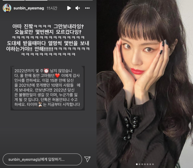 이선빈은 “2022년까지 몇 주 남지 않았습니다. 올 한 해 동안 고마웠던 이에게 감사 인사를 전하세요. 이걸 15분 안에 당신을 2021년에 웃게 했던 10명의 사람들에게 보내세요. 안 보낸다면 2022년 당신은 불행한 일이 생길 것이며 누군가를 잃게 될 것입니다”라는 내용의 행운의 편지 메시지를 받은 걸로 보인다.