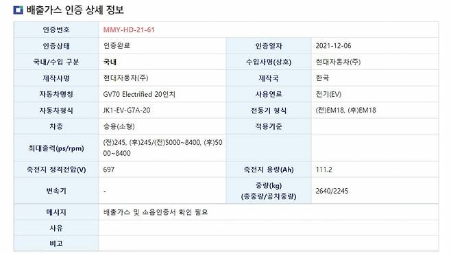 환경부에 따르면, 제네시스는 6일 GV70 전동화모델의 배출ㆍ소음 인증을 마쳤다. 대상은 19인치 및 20인치 휠을 장착한 모델로, 두 개의 전기모터를 탑재한 AWD 모델이다. GV60과는 달리 싱글모터 기반 후륜구동 버전은 배제됐다.