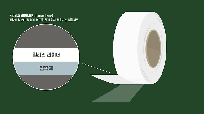 두 번째 방법은 테이프를 구성하는 지지체와 점착제가 잘 달라붙을 때 해줍니다. 돌돌 말린 테이프의 낱장들이 서로 안 떨어지려고 할 것이므로 지지체 윗면에 다른 물질이 잘 붙지 않는 릴리즈 에이전트라는 물질을 코팅해줍니다.