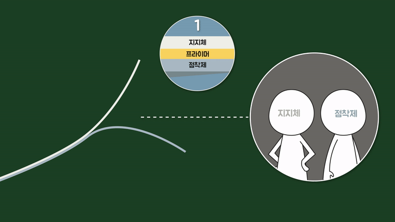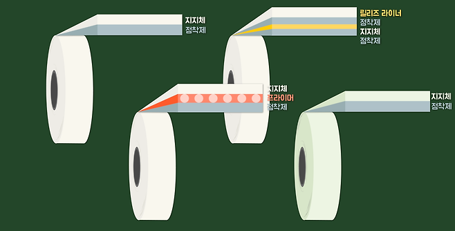 테이프의 구성을 1) 지지체-프라이머(지지체와 점착제라 잘 붙도록 도와주는 물질)-점착제의 구조로 만드는 방법과 2) 릴리즈 에이전트(낮은 표면 에너지 때문에 다른 물질이 잘 붙지 않는 물질)-지지체-점착제의 구조로 만드는 방법이 있고, 3) 두 가지 방식을 모두 이용한 방법이 있습니다.