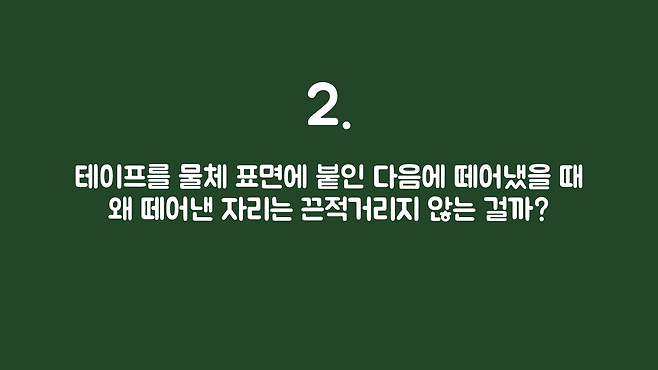 낱장으로 떼어냈을 때 끈적거리는 안쪽 면에 붙어있던 바깥쪽 면은 왜 끈적거리지 않는 걸까요? 마찬가지로 테이프를 물체 표면에 붙인 다음에 떼어냈을 때 떼어낸 자리는 왜 끈적거리지 않는 걸까요?