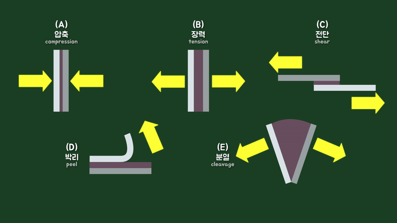 일반적으로 점착제에 가해지는 힘(stress)의 방향은 5가지가 있고, (d) 박리(peel)의 경우에는 25mm 테이프 기준으로 0.2~0.5kg의 무게로 당기는 힘을 견딜 수 있다고 합니다. 당연히 지지체와 점착제 사이의 강도는 이보다 높은 힘을 견딜 수 있도록 만드는데, 최대한 점착제가 남지 않도록 해야 하고, 이러한 성능을 테스트하는 방법을 박리시험(peel test)라고 합니다.