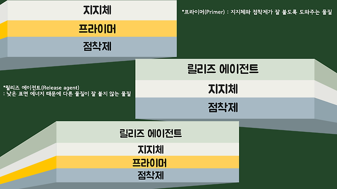 테이프의 구성을 1) 지지체-프라이머(지지체와 점착제라 잘 붙도록 도와주는 물질)-점착제의 구조로 만드는 방법과 2) 릴리즈 에이전트(낮은 표면 에너지 때문에 다른 물질이 잘 붙지 않는 물질)-지지체-점착제의 구조로 만드는 방법이 있고, 3) 두 가지 방식을 모두 이용한 방법이 있습니다.