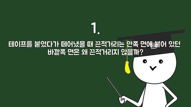 낱장으로 떼어냈을 때 끈적거리는 안쪽 면에 붙어있던 바깥쪽 면은 왜 끈적거리지 않는 걸까요? 마찬가지로 테이프를 물체 표면에 붙인 다음에 떼어냈을 때 떼어낸 자리는 왜 끈적거리지 않는 걸까요?