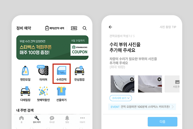8월까지 수리견적서를 요청해주신 100분께 매주 스타벅스 커피쿠폰도 드리고 있으니, 내 차 수리비용 견적서 이번 기회에 가볍게 받아보세요!