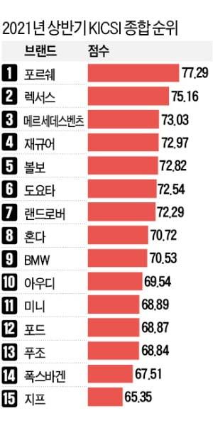 독일 폭스바겐그룹의 스포츠카 브랜드 포르쉐가 2021년 상반기 한국에서 사후서비스(AS)가 가장 좋은 수입 자동차로 평가됐다. 2위는 일본 렉서스, 3위는 독일 메르세데스벤츠가 차지했다. 한국경제신문이 국민대 자동차서비스연구소, 리서치기업 엠브레인, 한국소비자원, 보험개발원과 함께 조사해 13일 발표한 ‘2021년 상반기 한경 수입차서비스지수(KICSI)’ 평가 결과다.