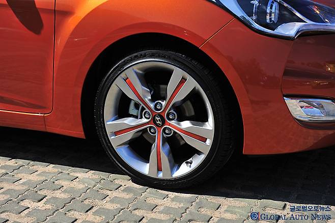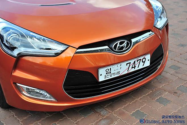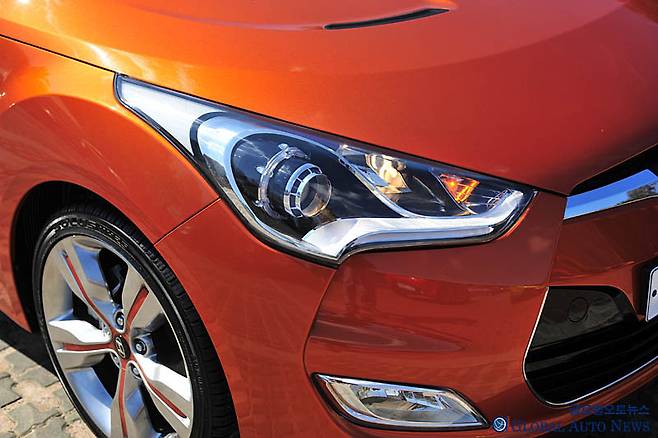 프론트 엔드에서는 예의 헥사고날 라디에이터 그릴과 펜더 중앙까지 파고 들어간 헤드램프가 현대자동차의 패밀리 룩을 만들고 있다. 에어인테이크 부분을 넓게 처리해 공격성을 살리고 있다. 보닛 위에 별도의 T자형 캐릭터 라인과 에어 인테이크 모양의 오너먼트를 넣어 ‘펀(Fun)’을 살리려 하고 있다. 유저가 테이핑 처리를 할 것을 염두에 둔 듯하다. A필러를 블랙 컬러로 처리한 것도 엑센트로 작용하고 있다.