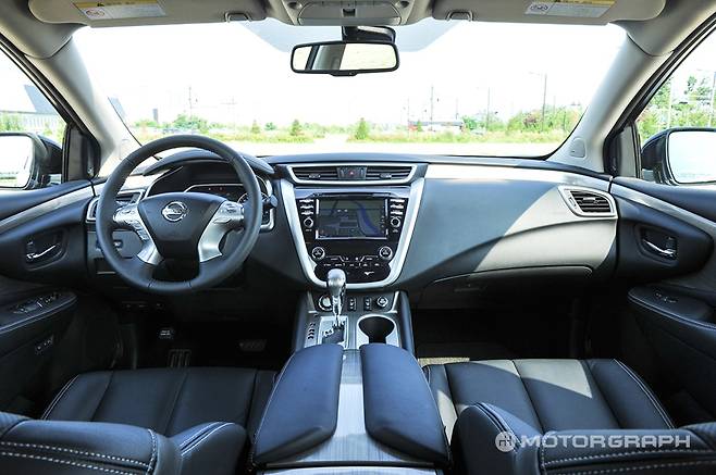 이전 세대 무라노의 실내 디자인은 인피니티와 많이 닮았었다. 전체적인 디자인이나 세부적인 부품, 버튼 배열 등이 인피니티에서 많은 영향을 받았다. 신형 무라노는 닛산이 강조됐다. 인피니티 특유의 ‘랩 어라운드’ 스타일은 여전히 남았지만, 구성이나 세부적인 모습은 영락없는 알티마다.
