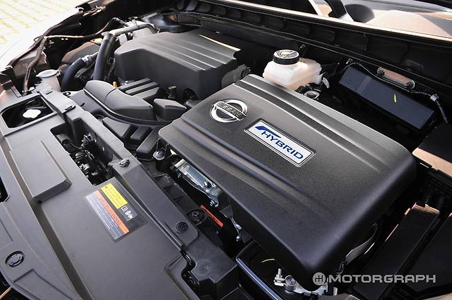 닛산은 이와 완전히 반대다. 엔진의 비중이 훨씬 크다. 또 효율보단 성능에 초점이 맞춰진 슈퍼차저 엔진이 장착됐다. 2.5리터 4기통 슈퍼차저 엔진은 최고출력 233마력, 최대토크 33.7kg.m의 성능을 발휘한다. 전기모터의 역할은 아주 미미하다. 출력도 그리 높지 않다. 최고출력은 20마력, 최대토크는 16.3kg.m다.