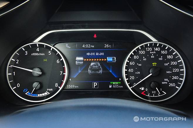 전기모터는 엔진과 변속기 사이에 위치했다. 스스로 무언가를 주도할 입장은 아니다. 철저하게 엔진을 보조하는데 그친다. 하이브리드의 특권과도 같은 ‘EV 모드’는 거의 사용할 수 없다. 시동을 걸면 거의 곧바로 엔진이 동작한다. 에너지흐름도를 유심히 살피고, 발끝을 미세하게 움직여도 전기모터만으로 달리는 것은 어렵다. 또 일단 엔진의 회전수가 높아지기 시작하면, 전기모터의 토크도 느끼기 힘들다. 한편으론 엔진과 전기모터가 제각기 작동할때 생기는 이질감이 거의 없다는 장점도 있다.