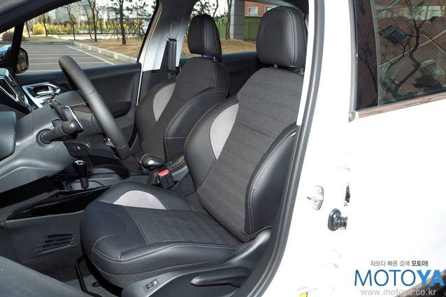 2008의 앞좌석은 불쑥 돌출된 사이드볼스터가 눈에 띈다. 강도도 적당히 단단하여 급격한 코너를 돌아 나갈 때, 탑승자의 옆구리를 든든하게 잡아준다. 착좌부의 질감 역시 약간 단단한 편이며, 가죽 재질과 함께, 부분적으로 직물이 적용되어 있다. 앞좌석의 조정은 하단의 펌핑식 레버와 등받이 옆에 붙은 조그만 레버로 이루어진다. 하단의 펌핑식 레버는 높낮이를, 측면의 작은 레버는 등받이의 각도를 각각 조절한다. 3단계의 열선 기능을 제공한다.