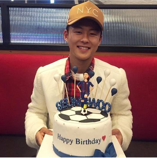 이승우가 미소지으며 들고 있는 케이크에는 'Happy Birthday' 문구가 크게 적혀 있고 축구공 무늬와 함께 바르셀로나 유니폼을 입은 축구선수 인형이 장식돼 있다.