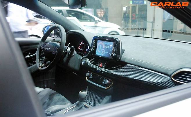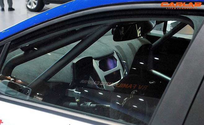 실내는 영락없는 레이싱카입니다. 운전석만 최적화됐던 아반떼 스포츠 튜익스와는 달리, 실내 전체를 오직 레이싱을 위해 꾸민 것을 볼 수 있습니다. 레이싱전용 D컷 스티어링 휠과 스크린, 레이싱 버킷 시트, 롤케이지 등이 대표적입니다.